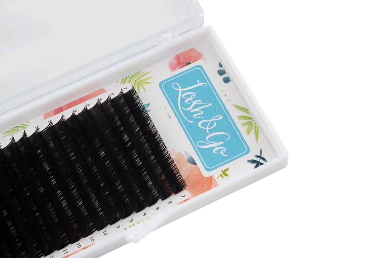 Klassische schwarze Wimpern für Lash&Go-Extensions aus hochwertigen, elastischen Monofilamenten mit einer gleichmäßig satten Farbe bis in die Spitzen.